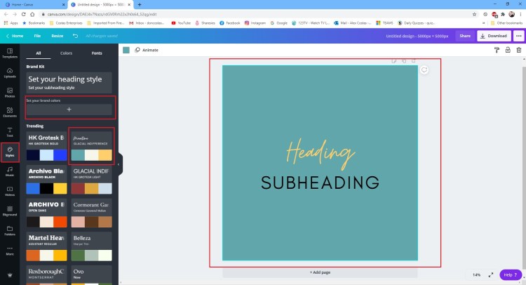 So what are styles? Styles are away of applying a colour and font scheme to your design. This is really handy if you need to set up a business colour scheme! If you are a Pro user you can ensure your business style is always available and once you have a object, simply click your style on the left and everything about your object gets styled the way you want it. This makes everything consistent … which is great for your brand.